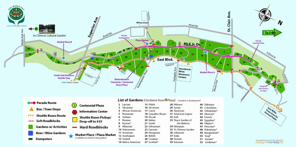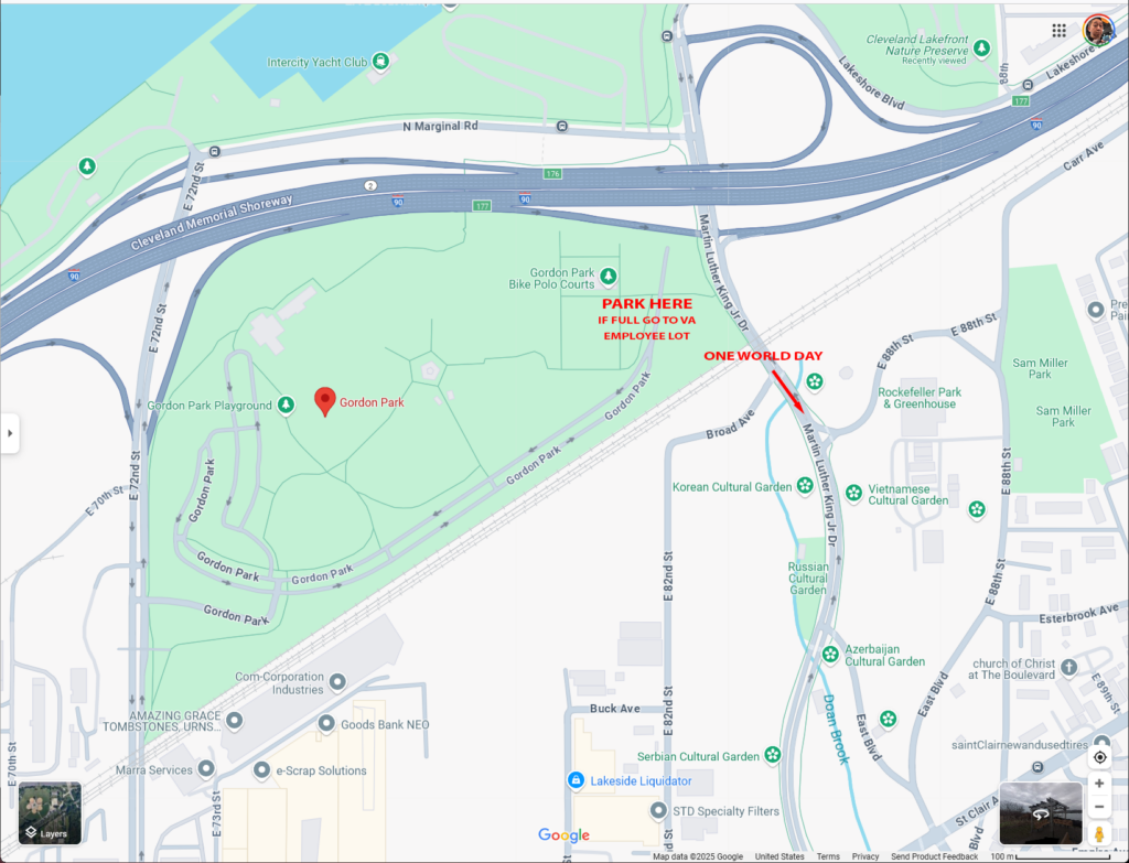 Or the VA Hospital’s employee parking lot at 1606 E. 105th Street, Cleveland, OH 44106. 3 bus shuttles will be available to bring patrons to and from the VA employee parking lot to the south entrance of One World Day and through East Blvd. only. 3 school buses will be available to shuttle people to the South end of the gardens on East Blvd. See below for directions.